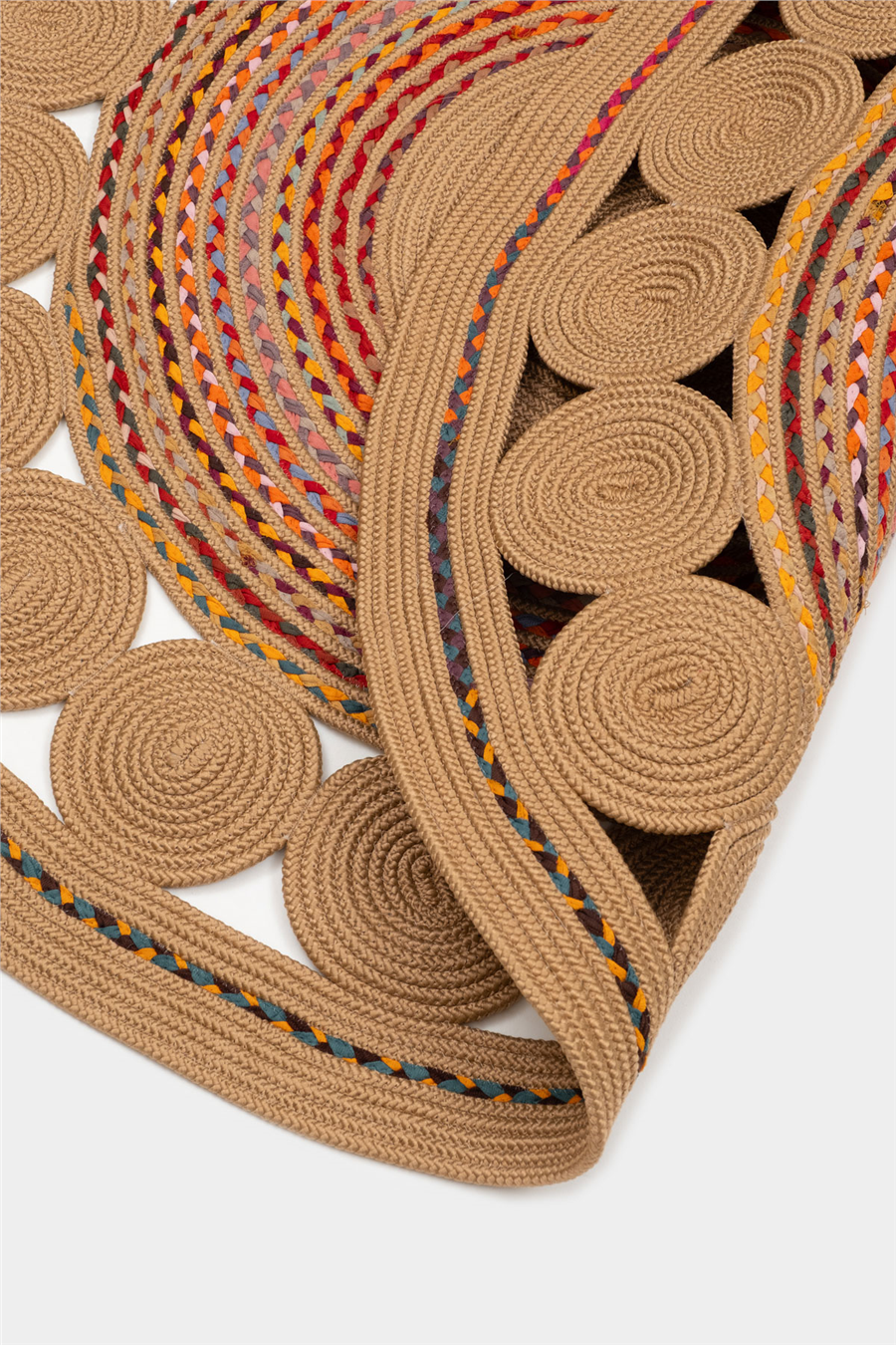 Renkli Rumi Yuvarlak Çift Taraflı Jüt Halı, güncel dekorasyon trendlerine uyum sağlayan modern bir duruş sunar.