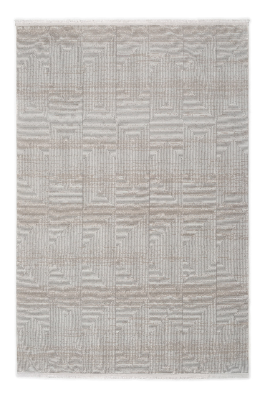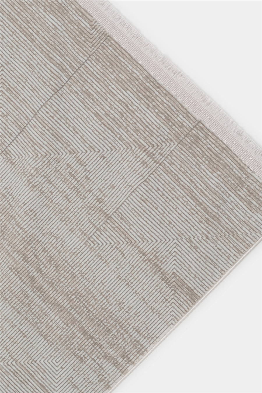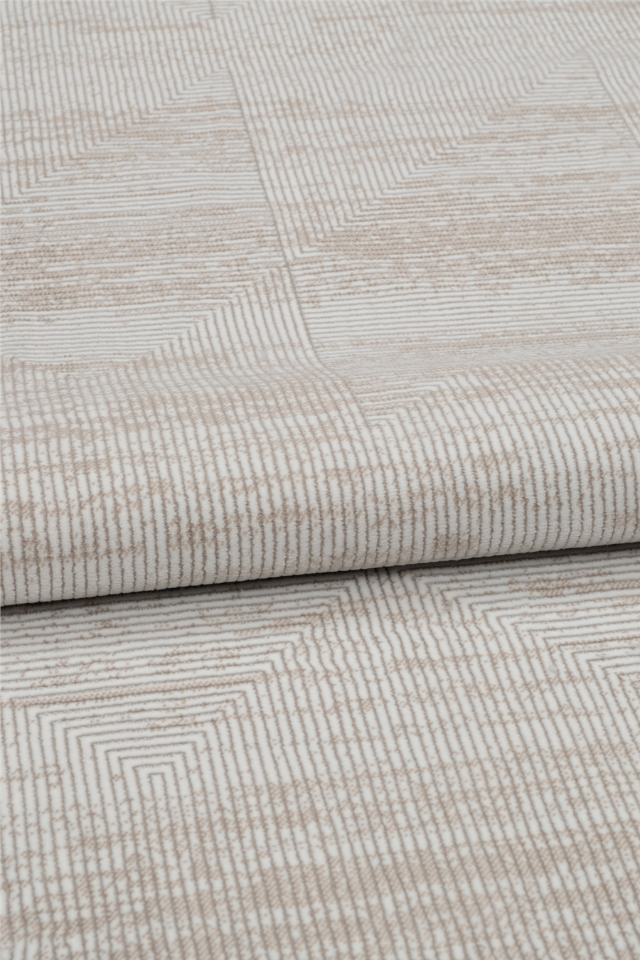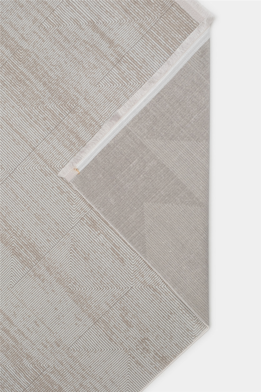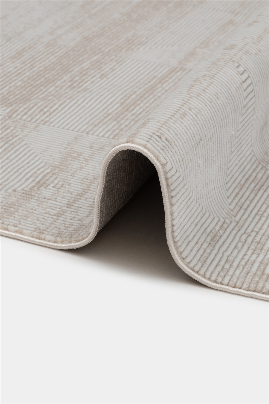 Ekru-Vizon Velar Kabartmalı Patchwork Desenli Kaymaz Taban Saten Bambu Halı, dekorunuzu yormadan tamamlayan rafine bir görünüm sunar.